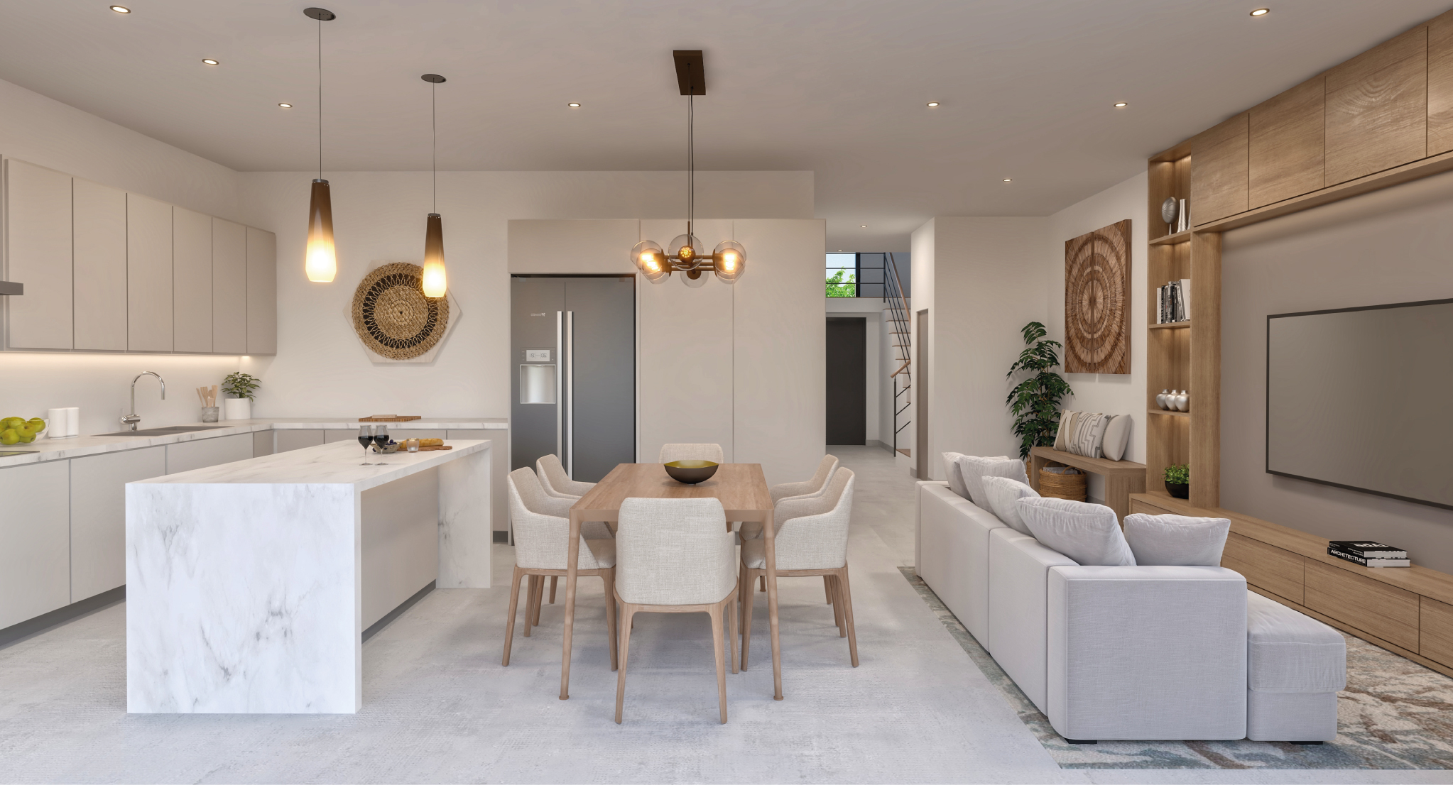 3 Bedrooms – 2.5 Bathrooms / Just one shared wall – enhanced privacy / Larger outdoor area and open green space / Kitchen and social area integrated with the backyard / Seamless transition from indoor to outdoor living