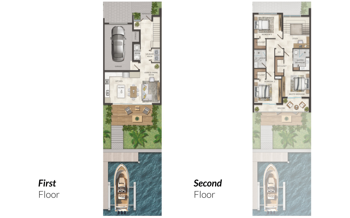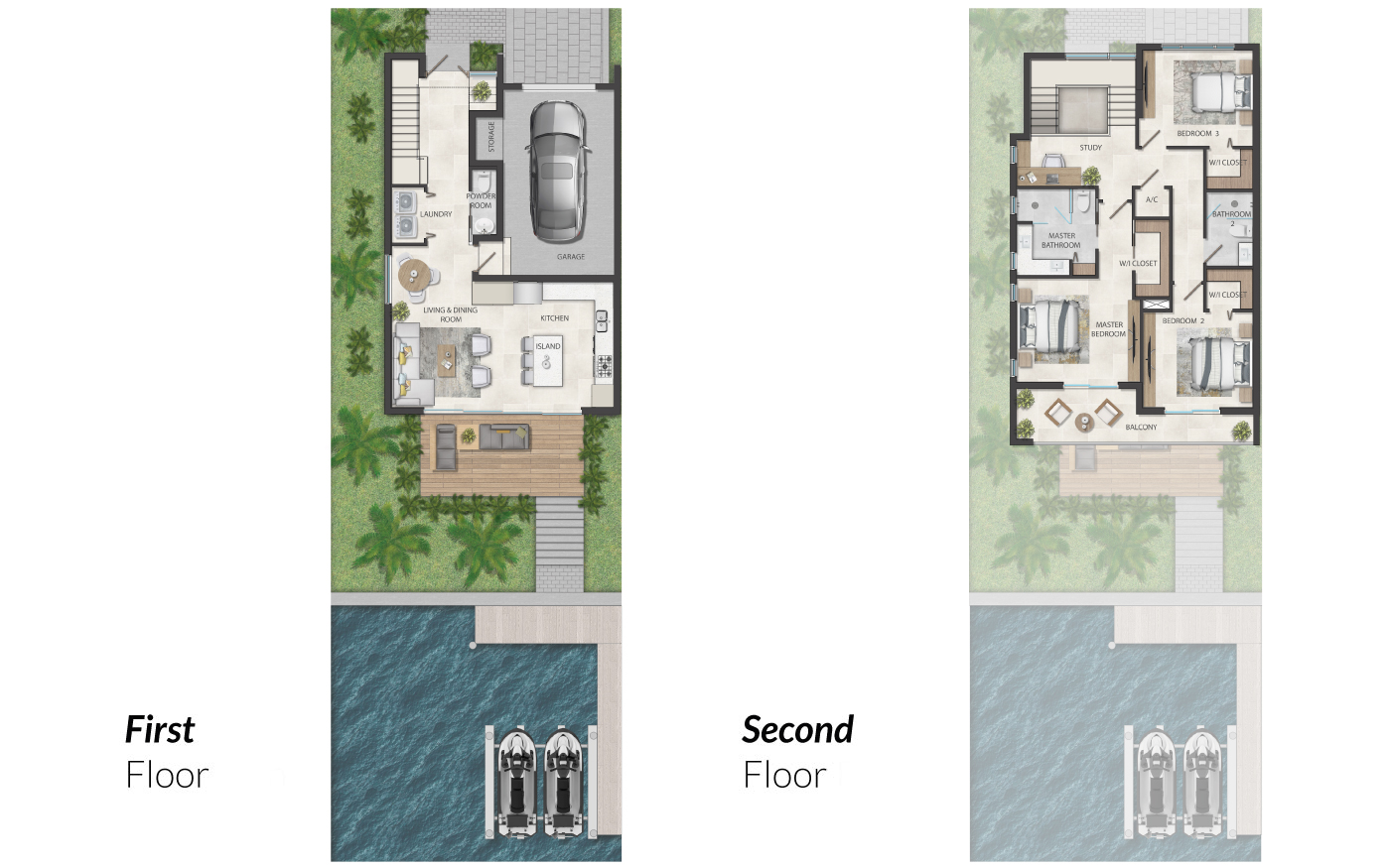 3 Bedrooms – 2.5 Bathrooms / Spacious kitchen with island / Living and dining areas open to the garden / Private deck with direct yard and slip access / Efficient distribution for everyday comfort / Boat slip